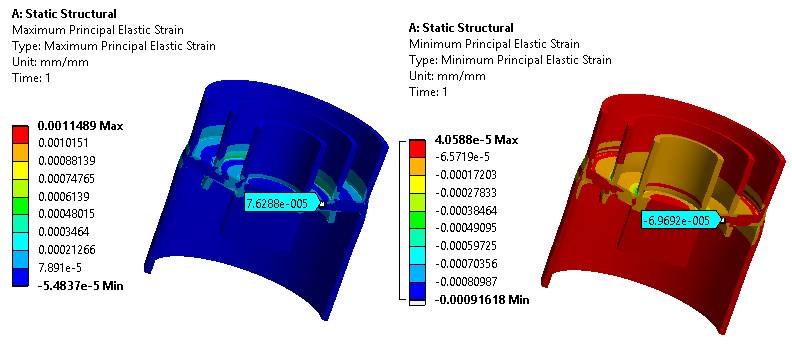 得到了下面的結(jié)構(gòu)與結(jié)果,看起來不錯,第一主應(yīng)變和第三主應(yīng)變達(dá)到近300微應(yīng)變。采用兩片半橋片(通常用于測量Mx的那種)就可以組成全橋了。但這只是原理罷了,在這種曲面上貼片也許對于貼片人員來說是一種挑戰(zhàn)!