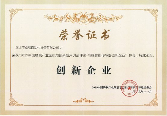 優(yōu)秀的創(chuàng)新產(chǎn)品往往離不開背后同樣優(yōu)秀的企業(yè),在產(chǎn)品獲得殊榮的同時,企業(yè)自然也不例外。本屆高交會期間,卓航精密斬獲“2019中國五連產(chǎn)業(yè)領(lǐng)航與創(chuàng)新應(yīng)用典范評選——高端智能傳感器創(chuàng)新企業(yè)”稱號。
